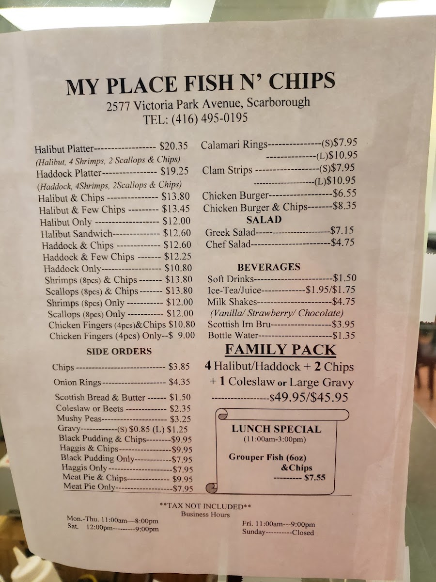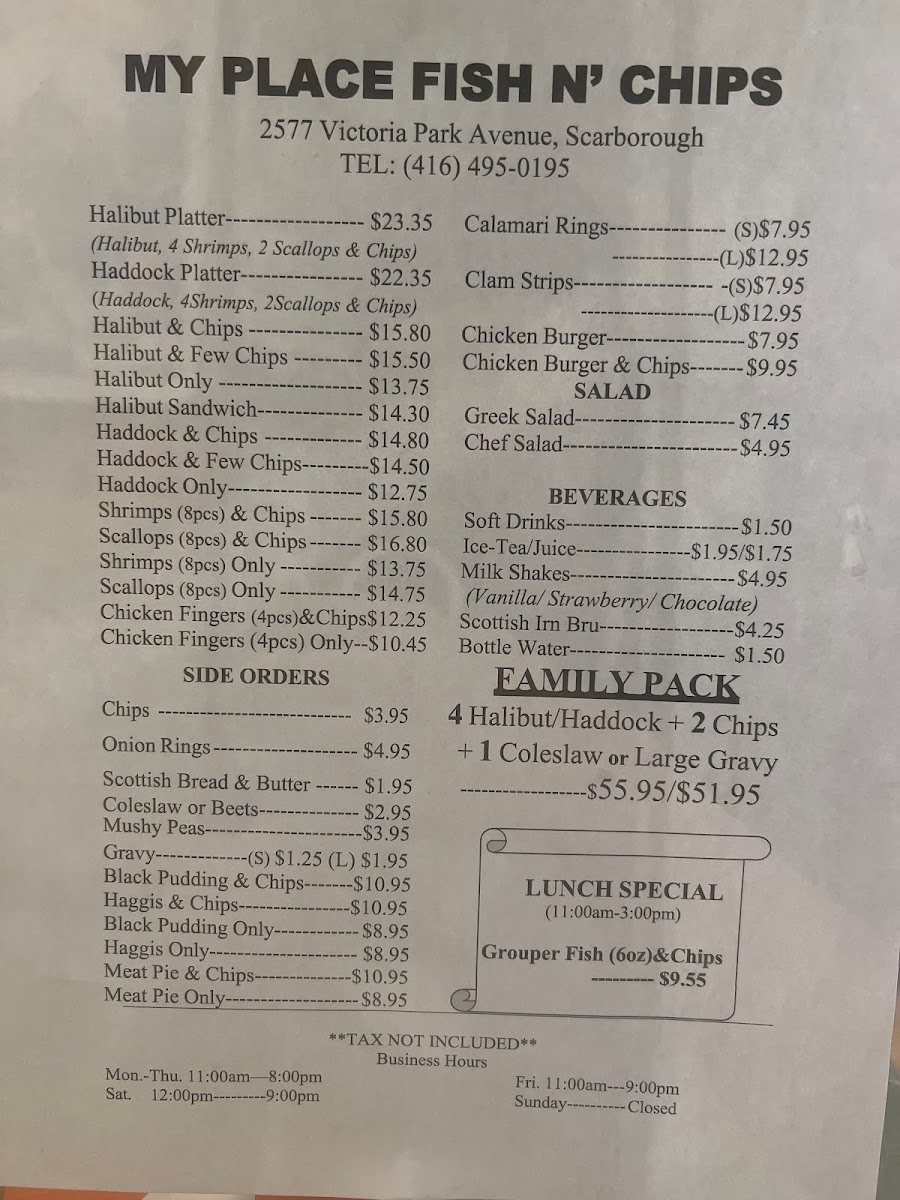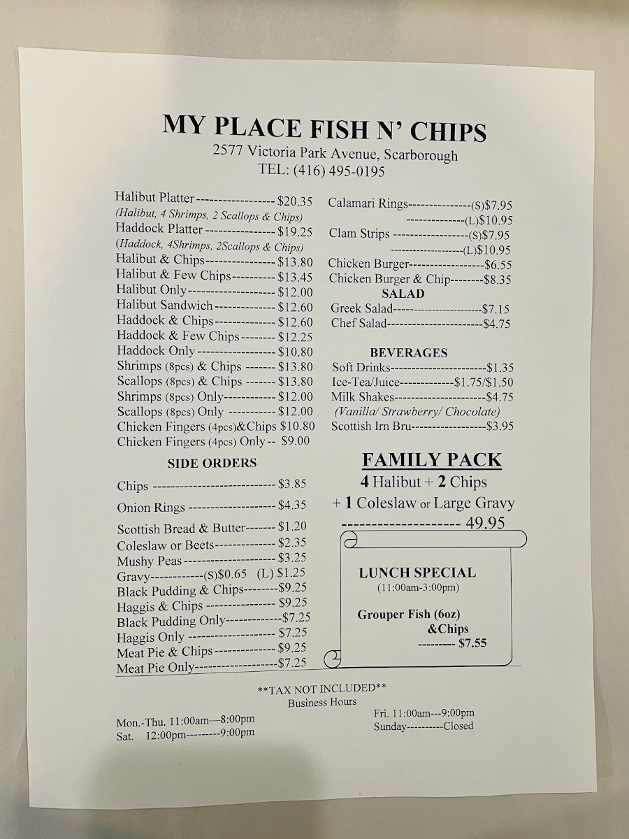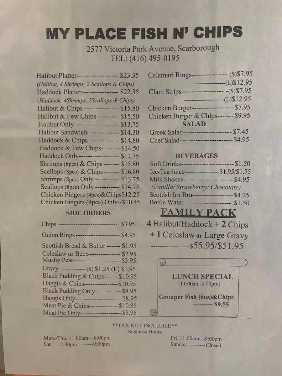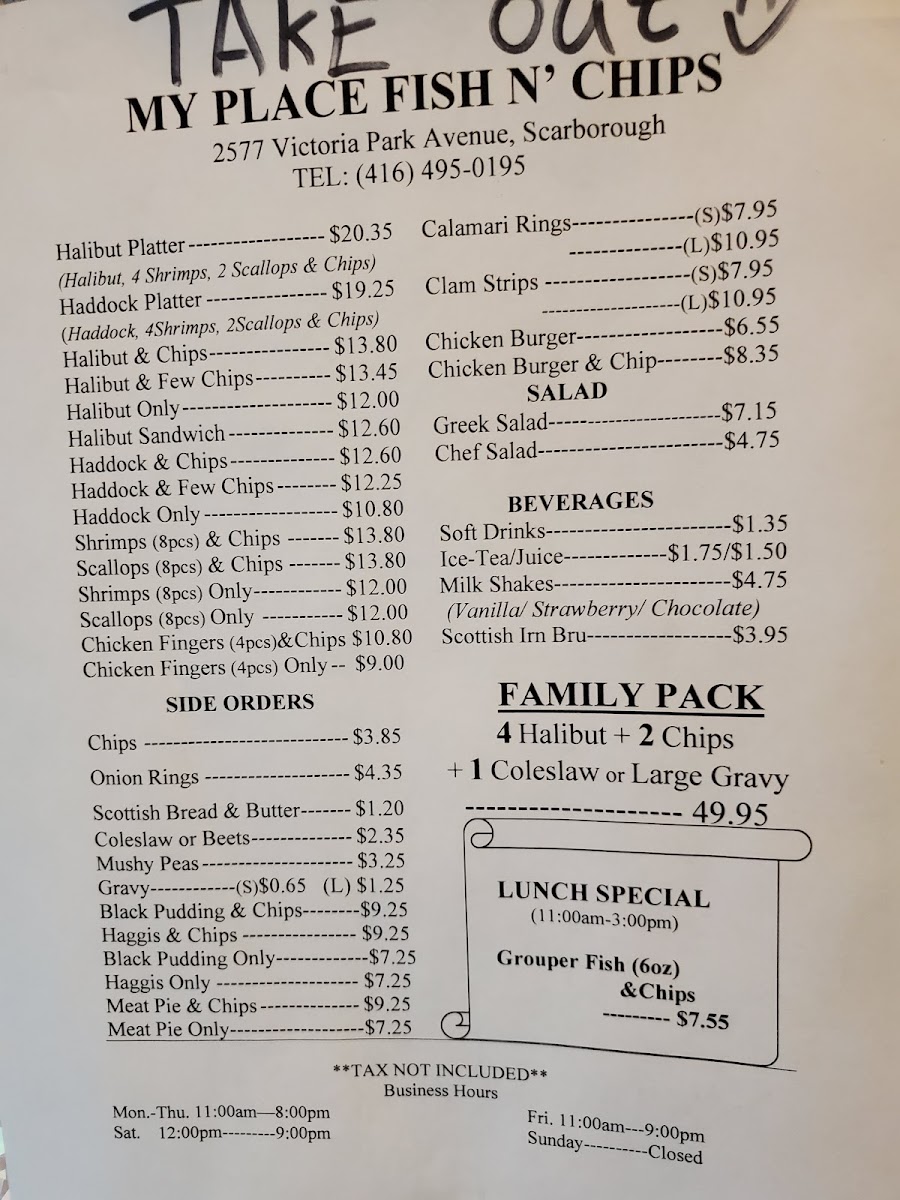 Welcome to My Place Fish & Chips, a beloved fish and chips restaurant located at 2577 Victoria Park Ave, Scarborough. This family-owned establishment has garnered a devoted following for its commitment to quality and service. The menu features mouth-watering options like halibut and haddock, expertly cooked with the perfect amount of seasoning, ensuring every bite is a delight.